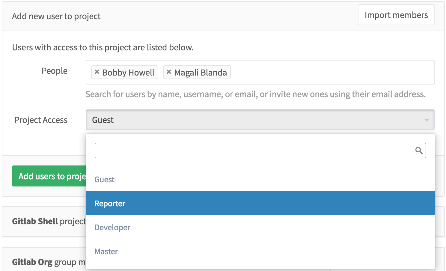 Select the one you want and hit Import project members. A flash message notifying you that the import was successful will appear, and the new members are now in the project's members list. Notice that the permissions that they had on the project you imported from are retained.